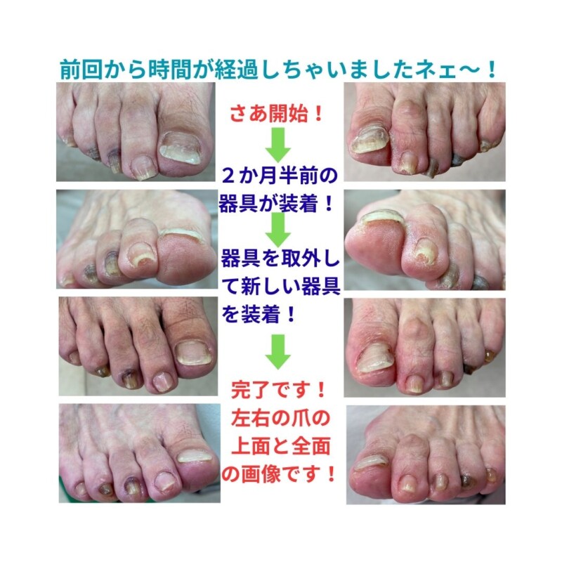 約2か月半前に巻き爪補正器具を装着された方の経過写真です。