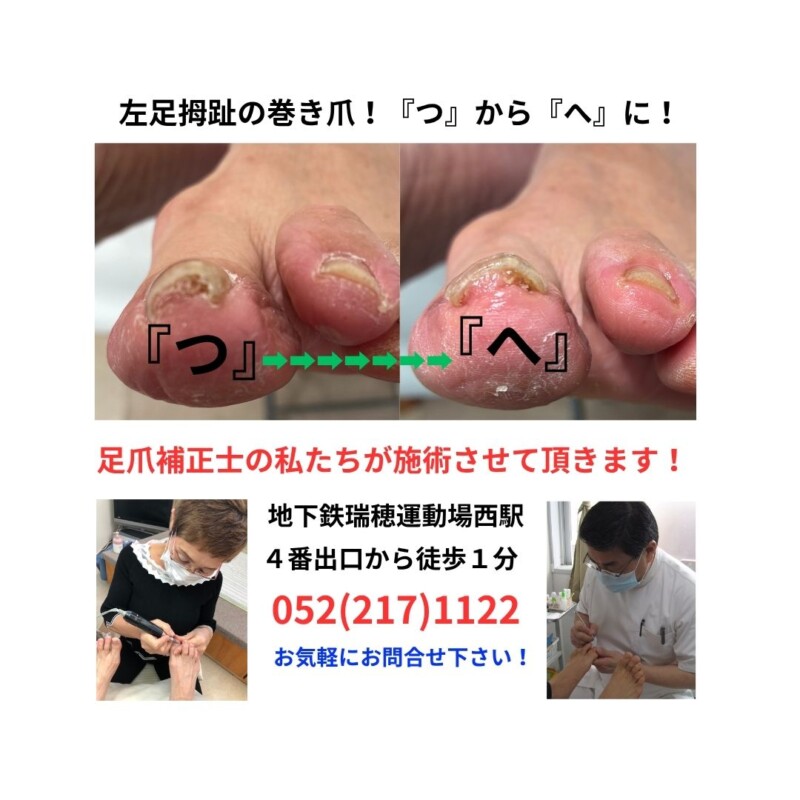 今回の施術では、左足拇趾の強いカーブ(『つ』型)だった爪が、補正により自然な形(『へ』型)に近づきました。