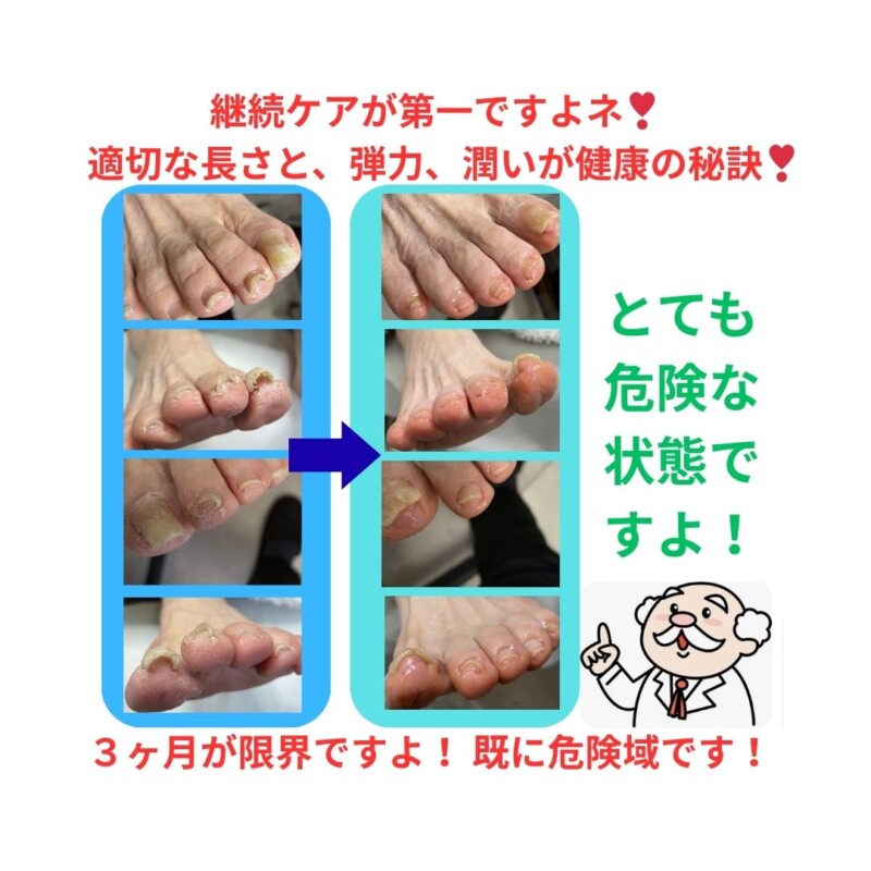今回の画像のように、肥厚して伸び放題の爪や乾燥で変形した爪を放置すると、