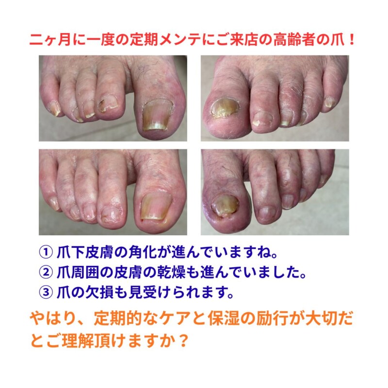 二ヶ月に一度の定期メンテナンスにご来店の高齢者様の爪