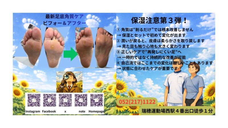 巻き爪 #陥入爪 #爪切り #深爪 #変形爪 #爪甲鉤湾症 #うおのめ #たこ #イボの治療前ケア #外反母趾 #補整ソックス #ケアソク #インソール #SUPERfeet #連動操体法 #操体法整体 #腰痛 #膝痛 #脊柱管狭窄症 #変形性膝関節症 #名古屋市瑞穂区 #瑞穂運動場西 #バイリンガルスタッフ #剣道好きスタッフ #潜水士スタッフ #日本己書道場 #己所六三四道場 #魚の目ケア #タコ除去 #足裏ケア #いいねした人全員フォロー #相互フォロー #登山 #フットケア #沈黙の艦隊 #TOKYO MER #アイススケート #卓球 #からだ110ばん #高齢者爪切り #高齢者フットケア #介護美容 #奇跡の化粧品 #自宅で顔が変わる #CHARIS化粧品 #REENECELL #奇跡のスキンケア化粧品 #驚異の韓国コスメ #神社参り#カリス化粧品#ルネセルスキンケア#ルネセル化粧品