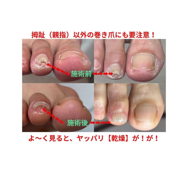 今回のお客様も、親指以外の爪が巻き込んでしまい、歩行時に違和感が出ていました。施術後は圧迫感が軽減し、見た目も自然な形に整いました。