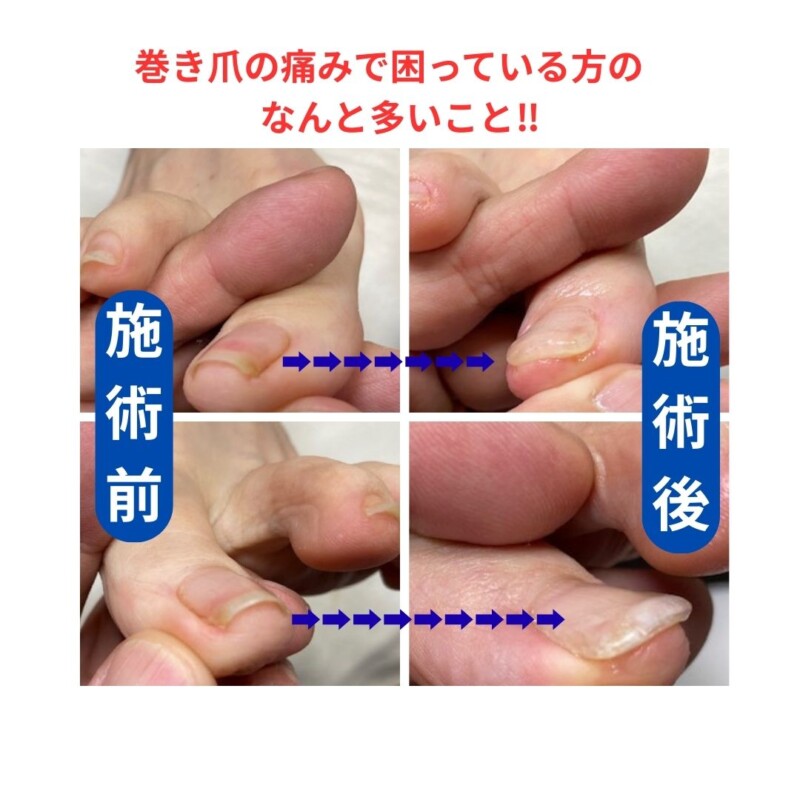 当店では 痛くない巻き爪ケア を行い、画像の通り