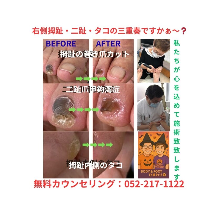写真のように【巻き爪カット+肥厚爪の整え+タコ除去】を同時に行うことで、