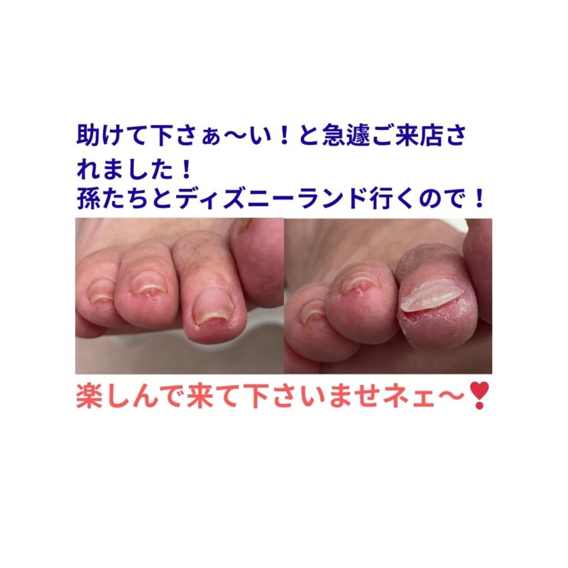 「孫たちとディズニーランドへ行くので助けて!」と急遽ご来店されたお客様。足先の爪が食い込みはじめ、危うく陥入爪になる一歩手前の状態でした。