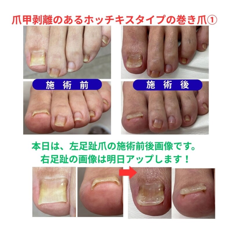 今回ご紹介するのは「爪甲剥離のあるホッチキスタイプの巻き爪」です。