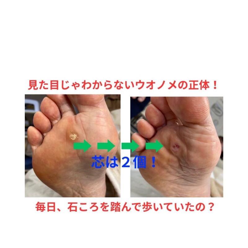 一見ただの角質のように見えるウオノメですが、実は皮膚の奥に「芯」ができています。これが小石を踏んだような強い痛みの原因です。画像のケースでは芯が2つも隠れていました。放っておくと歩行バランスが崩れ、膝や腰にまで負担をかけることもあります。専門的なケアで芯をしっかり取り除くことが大切です。
