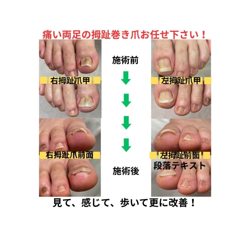 施術前後の写真からもわかるように、爪の形状が整い、見た目の改善とともに、歩きやすさも向上しています。