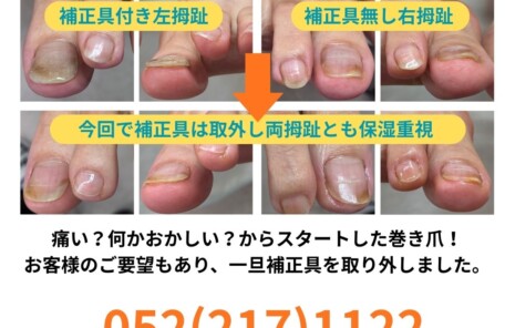 典型的な巻き爪の補正例です!痛みを我慢せず、早めのご相談を!
